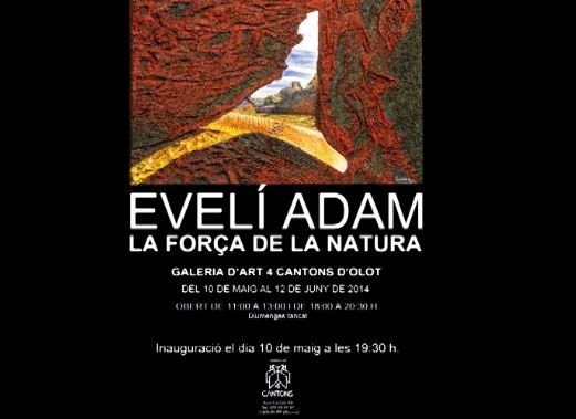 L'artista ripollès Evelí Adam exposa a la Galeria d'Art 4 cantons d'Olot a partir del 10 de maig, fins el 12 de juny. L'obra, titulada ‘La força de la natura’, és el resultat de l'experimentació de l'artista amb diferents materials, textures, colors i suports, amb la intenció de ser un elogi a la natura i la seva bellesa.