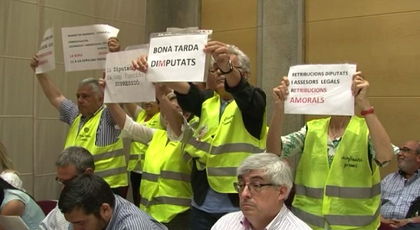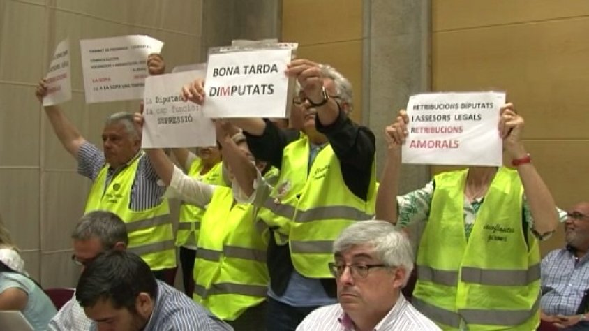 Segons les seves pancartes demanaven la supressió de la Diputació perquè no serveix per a res. També es queixaven dels sous que cobren els diputats, que segons apuntaven, són amorals. Per contra, s'ha aprovat per unanimitat ampliar la subvenció per a la instal·lació de plantes de biomassa als municipis. Amb això s'arribarà fins a un milió dos-cents mil euros el pressupost que es dedica a potenciar energies més netes als consistoris gironins. També en aquest ple, és la primera ocasió en què Maria Teresa Farrés ha exercit de portaveu, agafant el relleu de Pia Bosch.