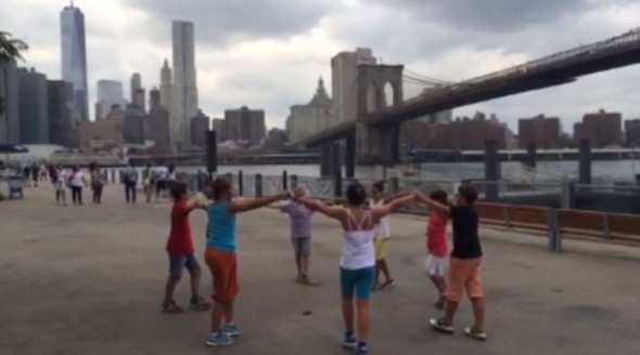 Els actes de celebració de l’11 de Setembre no s’han acabat. De fet aquest dissabte se celebrarà a més de sis mil quilòmetres d’aquí, concretament a Nova York. I serà un grup garrotxí qui ho protagonitzarà. L’Associació Sardanista Flor de Fajol té preparats diferents actes com una ballada de sardanes al costat d’un dels ponts més famosos de l’illa de Manhattan, el de Brooklin. Ahir es van sumar als actes de la Diada representant la 'V' i van fer l'assaig de la sardana que ballaran aquest dissabte. Al fons es pot veure la zona financera de la ciutat dels gratacels.
