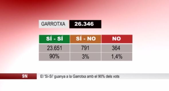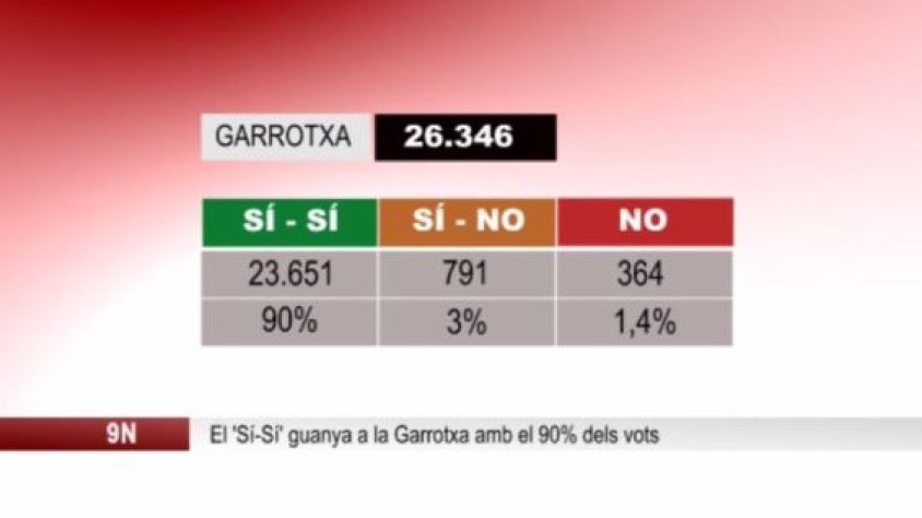 A la Garrotxa la jornada de participació ha deixat aquestes dades: van anar a les urnes 26.346 persones i el 90% van marcar el ‘Sí-Sí’, el que representen més de 23 mil 600 vots. El ‘Sí-No’ ha obtingut prop de 800 vots, un 3% del total, i el ‘No’ una mica més de 360, un 1,4%. La resta s’han repartit entre el vot afirmatiu en al primera pregunta i el blanc a la segona, amb un 0,9%; el vot en blanc, amb un 0,6% i les altres opcions, que han suposat un 2,3%.