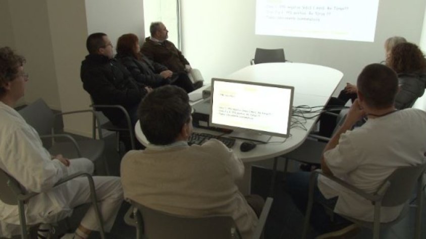 Aquesta és una de les reunions que cada mes té l'Equip Pediàtric de la Garrotxa. La peculiaritat és que hi assisteix més gent de les que es veuen a la sala: l'equip garrotxí forma part de les trobades interhospitalàries que organitza la Vall d'Hebron de Barcelona, amb la participació de deu centres hospitalaris de tot l'Estat. L'Equip Pediàtric de la Garrotxa aporta a les reunions casos reals de malalties infeccioses i immunologia infantil, mitjançant la videoconferència, per compartir coneixements amb els altres equips mèdics. Aquestes reunions serveixen per posar en comú protocols d'actuació, sobretot en casos de malalties gairebé oblidades que rebroten vingudes d'altres punts del planeta. Per a l'Equip Pediàtric de la Garrotxa, el treball en xarxa ha de guanyar presència en el seu dia a dia.
