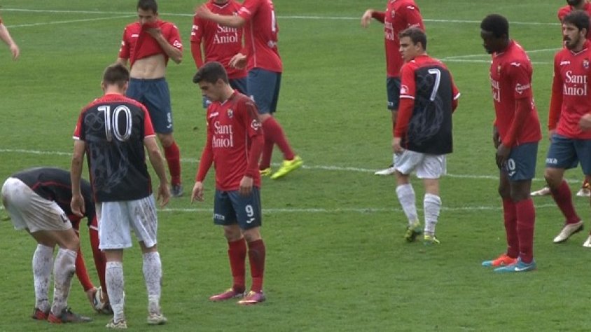 Carlos Martínez i la davantera olotina han estat faltats de punteria quan l'equip s'ha llençat a per l'empat, abans que el col·legiat igualés les forces dels dos equips expulsant per doble groga a Calavera a pocs minuts del final.