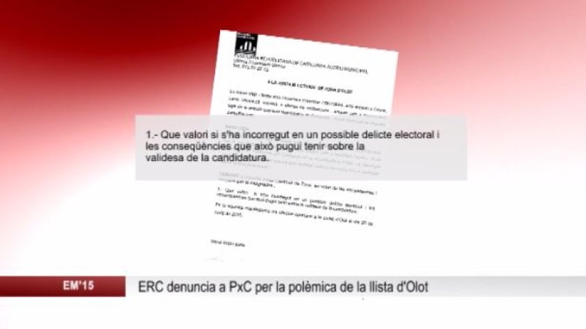 Esquerra Republicana de Catalunya ha presentat aquest dimecres al migdia una denúncia contra Plataforma per Catalunya per haver inclòs a la llista una persona que diu no tenir cap vinculació amb el partit. Els republicans han entrat el document a la Junta Electoral de Zona d’Olot, signat pel secretari del partit a Olot, Manel Mitjà, on demanen que es valori si Plataforma per Catalunya ha incorregut en un possible delicte electoral i les conseqüències que això pot tenir en la validesa de la candidatura. La denúncia s’ha tramitat aquest migdia als jutjats i ara caldrà esperar si la jutja electoral procedeix o no a la petició que fan els republicans.