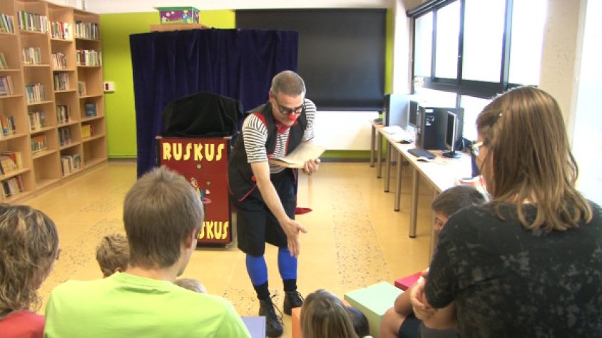 El pallasso Ruskus Patruskus anima l'Hora del Conte de la Biblioteca de La Bòbila a Les Preses