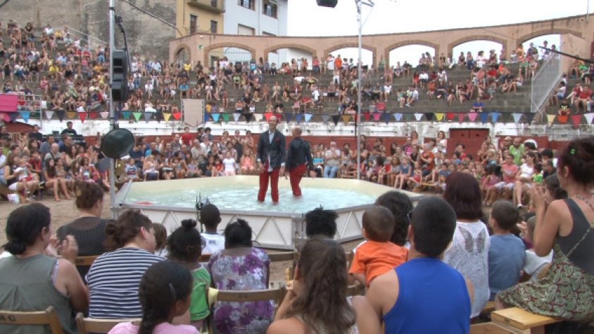 Un quiosc, dos músics, instruments i aigua. Aquests són els elements bàsics de l’espectacle que es va poder veure ahir a la plaça de braus d’Olot. Aquest espai és la principal novetat de l’activitat ‘Circ a la plaça’ que proposa el Teatre Principal d’Olot.