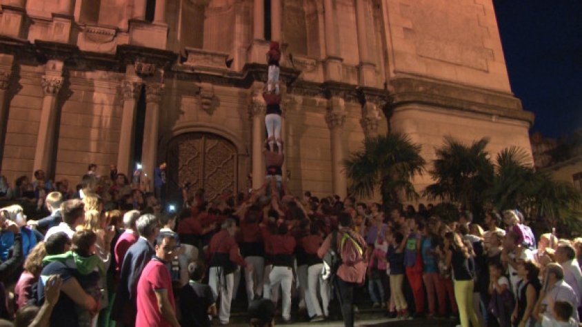 Els Xerrics d’Olot han fet aquest dissabte al vespre el tradicional pilar caminat per les escales de l’església de Sant Esteve. Amb un centre ciutat pel de gom a gom, els castellers olotins han demostrat un cop més el seu compromís i vàlua.