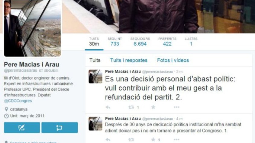 Després de 30 anys de dedicació a la política, l'olotí Pere Macias ha anunciat aquest matí a través de les xarxes socials que no es tornarà a presentar a les eleccions espanyoles. Macias ho ha comunicat a través de dues piulades al seu compte particular de Twitter. En la primera hi diu que "Després de 30 anys de dedicació política institucional m'ha semblat adient deixar pas i no em tornaré a presentar al Congreso". En una segona publicació ha afegit que "És una decisió personal d'abast polític: vull contribuir amb el meu gest a la refundació del partit".