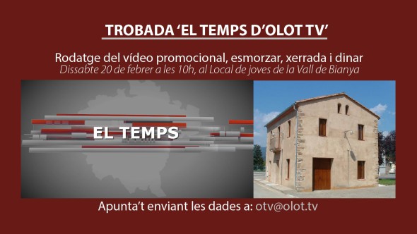 OLOT TELEVISIÓ organitza la primera trobada d'observadors meteorològics de la Garrotxa el proper 20 de febrer a la Vall de Bianya amb l'objectiu d'intercanviar experiències. El meteoròleg de la cadena, Roger Solé, explica que "a la nostra comarca hi ha desenes de persones que observen el temps diàriament". Gairebé tots col·laboren d'una manera o altre a l'espai 'El temps' d'OLOT TELEVISIÓ ja sigui aportant informació, fotografies, vídeos i contribuint en la difusió dels fenomens meteorològics. Roger Solé afegeix que "la trobada vol ser un reconeixement al suport que donen a l'espai de la televisió i al mateix temps una jornada per compartir totes les experiències" i per aquest motiu és obert a seguidors, espectadors, col·laboradors, observadors o fotògrafs. Aquesta trobada es farà el dissabte 20 de febrer, a les 10h, a l'Espai Jove de la Vall de Bianya, gràcies al suport de l'ajuntament d'aquest municipi, que ha posat totes les facilitats per la seva organització. La jornada arrencarà amb un esmorzar per continuar amb la gravació del proper espot promocional de l'espai 'El temps'. Tot seguit s'obrirà la xerrada on tots els participants podran aportar informació sobre meteorologia i compartir-la amb la resta de companys. Tot plegat acabarà amb un dinar de germanor al mateix municipi que acull la trobada. Les persones interessades en participar-hi han d'enviar un correu-e a otv@olot.tv indicant les seves dades personals (nom, cognoms i número de telèfon).
