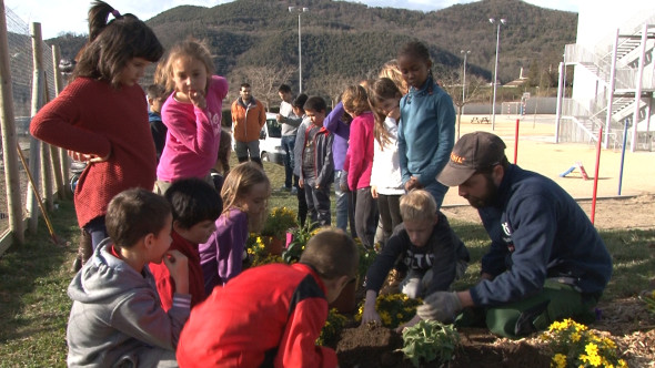 250 alumnes de primària d'Olot s'impliquen en el projecte Viles Florides amb la plantació de parterres florals