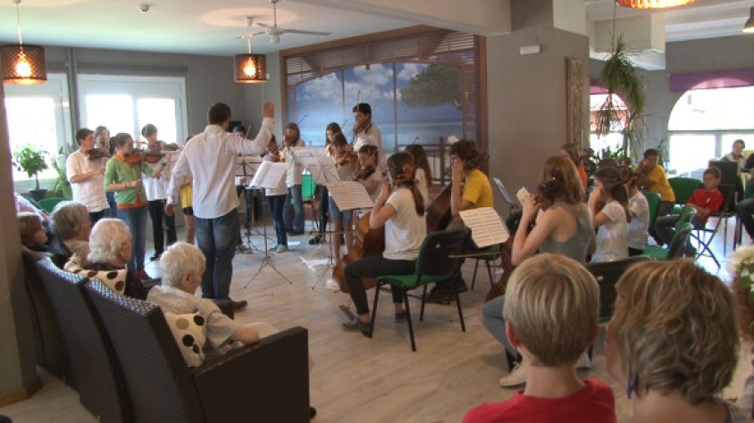 Una trentena d’alumnes de diversos conjunts instrumentals de l’Escola Municipal de Música van interpretar divendres diferents cançons a la residència La Tardor d’Olot. Aquest any han participat en aquesta experiència els nens i nenes del grup de guitarra o el grup de vent. El concert va acabar amb l’actuació de l’orquestra de corda de l’escola integrada per alumnes de totes les edats. No sempre hi participen tots els alumnes en aquest tipus de concert. Per a alguns, aquesta era la primera vegada que actuaven en una residència. L’activitat suposa una oportunitat per als residents de gaudir de música en directe sense moure’s del centre. Per als alumnes de l’escola, és una oportunitat per interpretar davant del públic els temes que han estat preparant durant mesos.