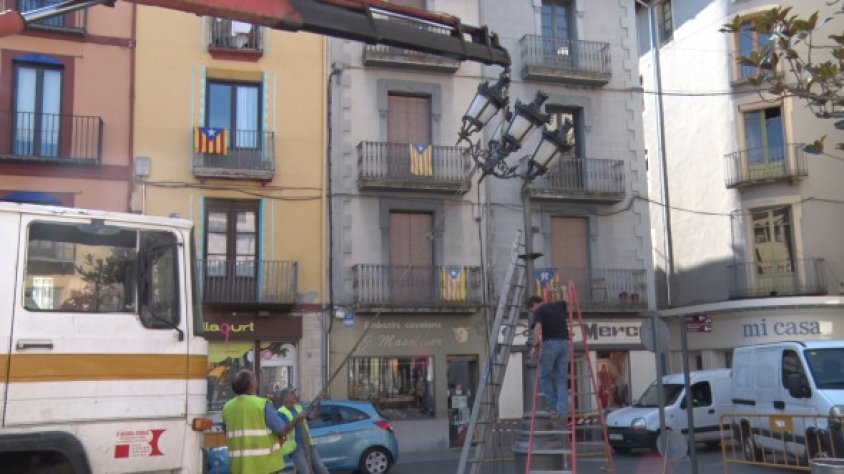 Aquesta setmana han començat els treballs d'instal·lació dels nous suports de llum i engalanament de la plaça Major d'Olot