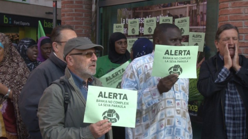 La Plataforma d'Afectats per la Hipoteca, amb el suport d'altres entitats, han volgut fer notòria aquest matí la seva protesta contra Bankia perquè, segons han manifestat, no han complert amb la paraula donada a tres famílies en exclusió social i risc d'exclusió residencial. Així es podia llegir en els cartells que han penjat a la façana de l'entitat bancària, i així ho proclamaven.