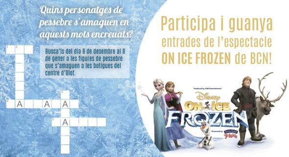 Aquest és el fulletó que aquestes festes poden completar infants i famílies passejant pel centre d’Olot. Fins al 8 de gener, poden buscar les figures de pessebre que s’amaguen als comerços olotins i completar les lletres que falten dels mots encreuats. Un cop desxifrat, cal deixar el fulletó amb les dades personals a l’Oficina de Turisme d’Olot. Tots els participants, que han de tenir menys de 12 anys, entraran en el sorteig de 4 entrades per a l’espectacle On Ice Frozen, que es representarà el 12 de març del 2017 a les 12 del migdia a Barcelona. El sorteig es portarà a terme el dimecres 11 de gener i s’informarà per telèfon al guanyador.