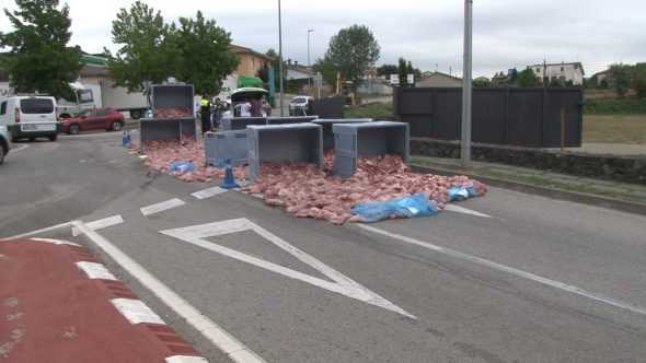 Un camió perd la càrrega de carn a la rotonda de la carretera de Santa Pau d'Olot