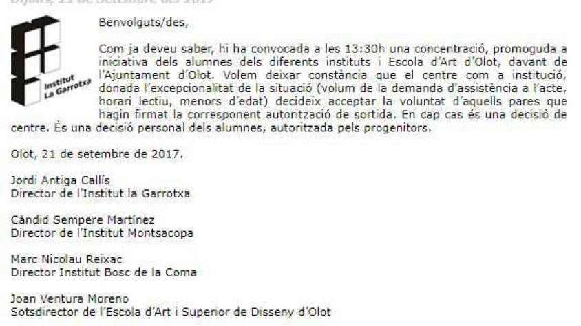 El text clarifica, d’entrada, que la convocatòria de la concentració era “promoguda a iniciativa dels alumnes dels diferents instituts i Escola d’Art d’Olot, davant l’ajuntament d’Olot”. Tot seguit els directors dels centres volen “deixar constància que el centre com a institució, donada l’excepcionalitat de la situació (volum de la demanda d’assistència a l’acte, horari lectiu, menors d’edat) decideix acceptar la voluntat d’aquells pares que hagin firmat la corresponent autorització de sortida”. En la mateixa carta els quatre centres detallen que “en cap cas és una decisió de centre” sinó que és “una decisió personal dels alumnes, autoritzada pels progenitors”.