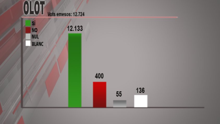 A Olot el 'Sí' ha guanyat amb 12.133 vots, el que representa un 95,36% del total dels vots emesos als 21 col·legis electorals