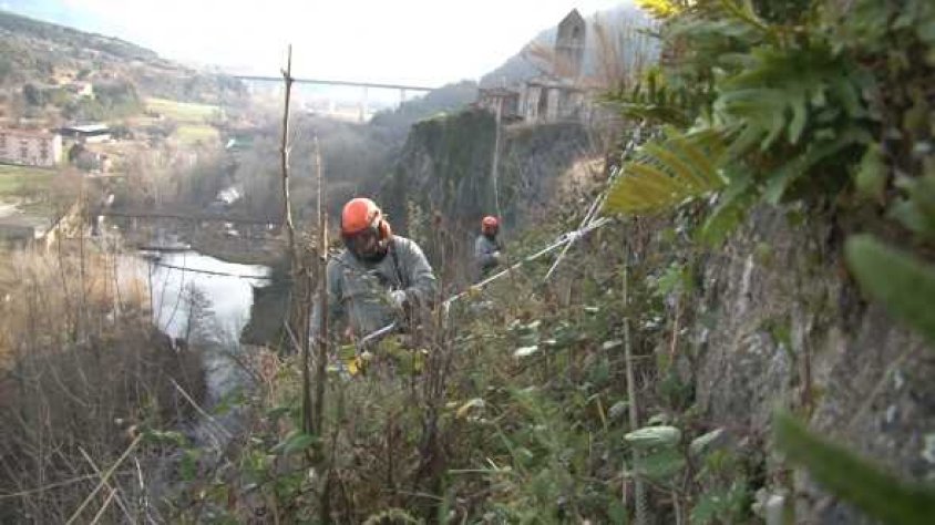 Els treballs de neteja selectiva de la vegetació del cingle de Castellfollit comencen amb les tasques més arriscades