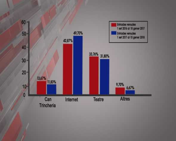 El Teatre també ha vist com les taquilles veien reduïda la seva activitat en dos punts, des del 33,76% del total de les entrades venudes per anar veure una obra, fins al 31,80% actual. Un canvi de tendència que també afecta les vendes en altres llocs, com explicava Pep Berga. Del pràcticament 10% al gairebé 6,5%. El que significa que el percentatge d’entrades que s’ha deixat de vendre presencialment, s’ha començat a adquirir per Internet en un canvi de tendència que, sembla, s’instal•larà definitivament aquest 2018.