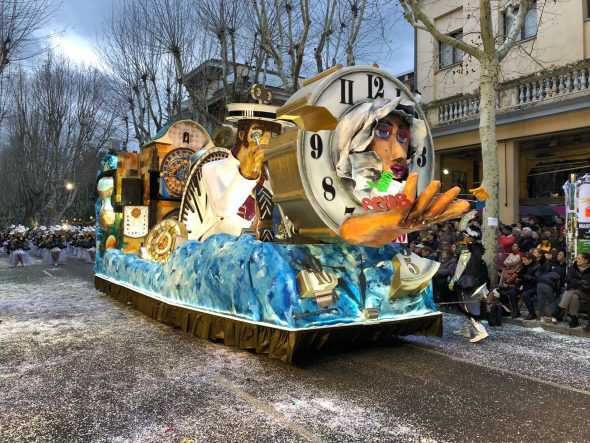 En la categoria de carrosses el primer premi, dotat amb 1.000 euros, és per la colla La Santjoanenca de Sant Joan les Fonts, amb el títol 'El pas del temps'. És una de les carrosses que ha despertat més sensacions a totes les rues de carnaval d'aquest 2018. La colla ha apostat per representar el temps amb un gran rellotge a la part frontal de la carrossa, un rellotger just al darrera i un rellotge amb figures en moviment. Tots aquests elements estan decorats amb colors molt vius que la fan encara més espectacular.