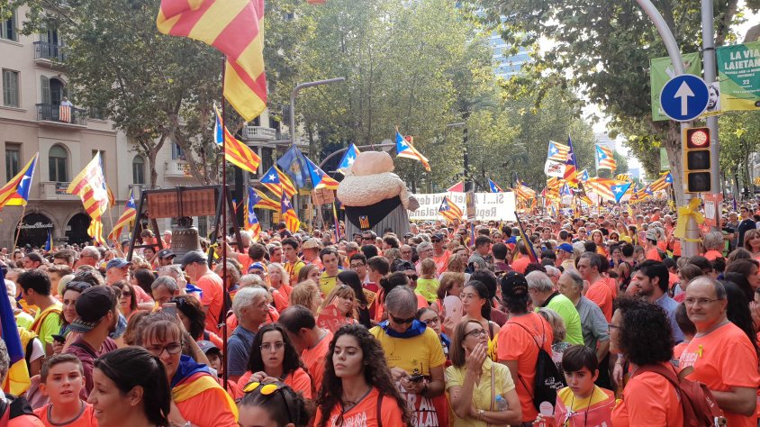 En qüestió de segons s'ha passat del silenci més rotund a la cridòria més absoluta, amb crits d'independència i reclamant l'alliberament dels polítics presos. El tsunami de crits que ha recorregut tota la Diagonal de Barcelona des del punt zero fins a Palau Reial.