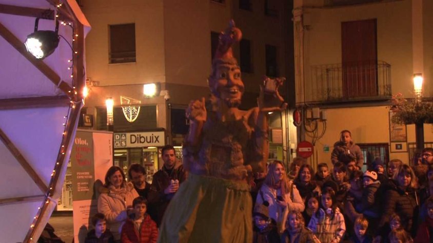 Desenes de nens i nenes, acompanyats dels seus pares, van aplegar-se a la plaça del Carme per escoltar, primer, el conte del ‘Tió, tió, cagatió’, de Xarli Reixach i Tavi Algueró, contat per la Pepa Contes, per tot seguit veure ballar el gegantó, per part de l’Esbart d’Olot i amb música dels Ministrers de la Bouera, interpretant una peça de Joan Josep Mayans en la qual s’hi podien veure tot d’instruments poc habituals.