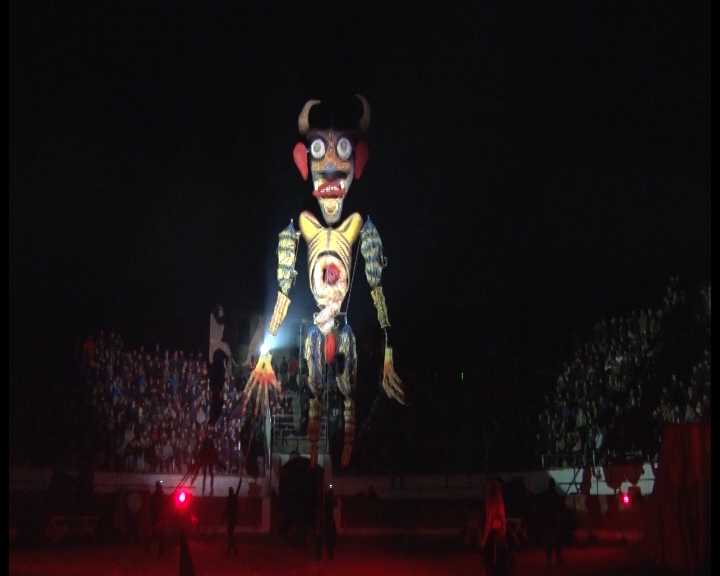 Dani Dorca, vicepresident Pim Pam Pum Foc: Hi ha una part del monstre gran que representa Vulcà, que és un element molt gros realment, ja que fa més de 10 metres d’alçada. El monstre és desmuntable, les seves extremitats són desmuntables, són com una mena de cavallets. Llavors, hi ha com aquest guinyo, hi ha música en directe en aquest espectacle, que li dona algun toc que també ens recordarà a algun element de Festes del Tura.