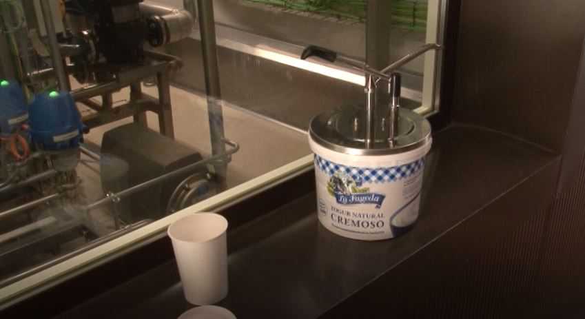 Sílvia Domenech, directora comercial Fageda: Una altra iniciativa que hem dut a terme en aquestes últimes setmanes, amb això hi portem treballant mig any més o menys, és el fet de poder donar resposta a poder comprar el iogurt a granel com es feia abans. El consumidor podrà anar a aquestes botigues, ell mateix a dispensar-se el iogurt i se l’endurà a casa amb el gramatge que vulgui, amb un envàs que és d’un material que es diu CPLA que prové del blat de moro.