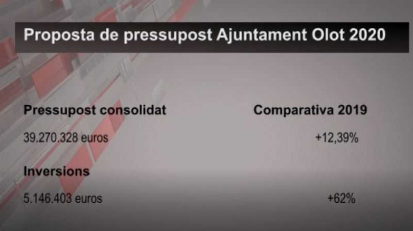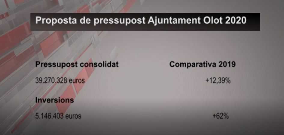 L’equip de govern ha presentat una proposta de pressupost consolidat de 39 milions d’euros per al 2020, un 12% més que al 2019, amb un capítol d’inversions de 5 milions, un 62% més que en l’exercici actual, el més alt dels últims 11 anys. Per al 2020 preveu una inversió de 1,9 milions per als barris de la ciutat, repartits entre millores estructurals, actuacions d’habitatge i actuacions de medi ambient, com salut pública o estalvi energètic. Per a equipaments es preveu una inversió de 300.000 eruos, 160 mil dels quals per a centres educatius, i per a l’Espai Cràter, 560.000 euros, el 20% del seu pressupost total. Per a Serveis Socials es preveuen 1 milió 200 mil euros i per a Educació, 1 milió 700 mil.