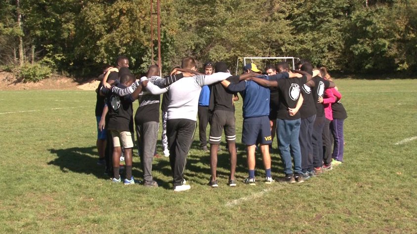 Ferran Ortiz, president Garrotxa Rugbi Club: Aquesta activitat la fem els dissabte al matí cada 15 dies. Venen aquí, fem una presa de contacte per escalfar i perdre la vergonya., i fem tant exercicis per treballar la coordinació com iniciació al rugbi.
