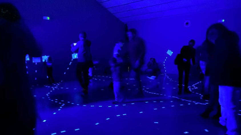 A través de la cançó ‘Somiatruites’ d’Albert Pla i il·luminats només per dos focus de llum negra, més d’una desena de nens i nenes d’entre 3 i 7 anys i els seus pares, dibuixaven amb retoladors cases, arbres, flors o persones deixant volar la seva imaginació.
