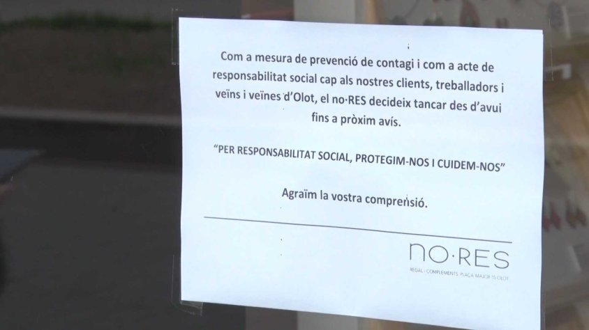 Molts dels comerços olotins tenien cartells a les seves persianes on anunciaven el tancament de l’establiment durant quinze dies, tots al·legant a la responsabilitat de la societat per controlar i prevenir la propagació del coronavirus. Molts acabaven amb un ‘cuideu-vos’ o un ‘ens en sortirem’.