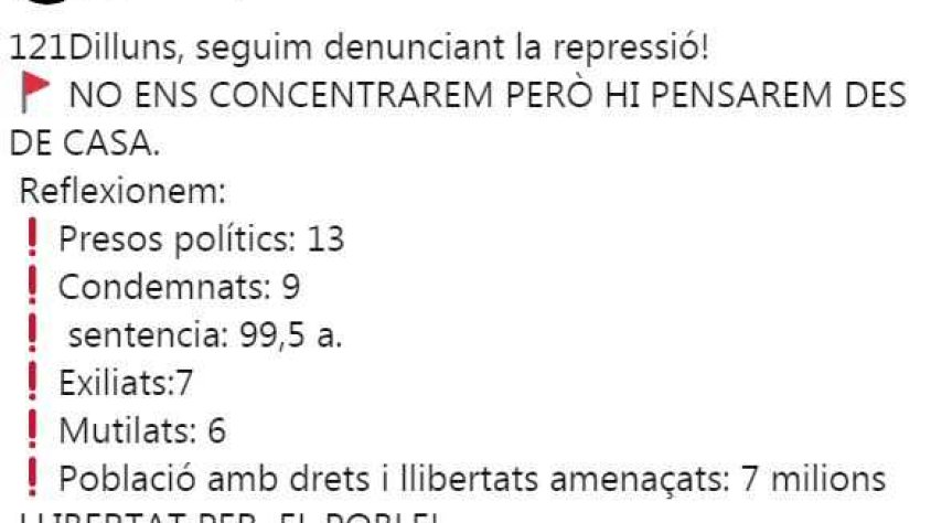 Per primera vegada després de 120 dilluns, és a dir, més de dos anys de protestes ininterrompudes, les entitats sobiranistes de la Garrotxa no es concentren aquest dilluns al vespre davant l'ajuntament d'Olot. L'Assemblea Nacional Catalana d'Olot ho ha confirmat en un tuit on, en compliment amb les recomanacions quedar-se a casa, insten als garrotxins a donar suport des de casa als polítics i líders independentistes a la presó i a l'estranger.