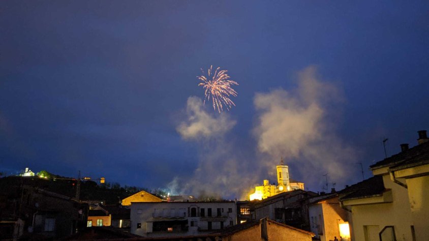 El Pim Pam Pum Foc il·lumina el cel olotí en reconeixement als veïns confinats quan es compleix un mes de l'estat d'alarma