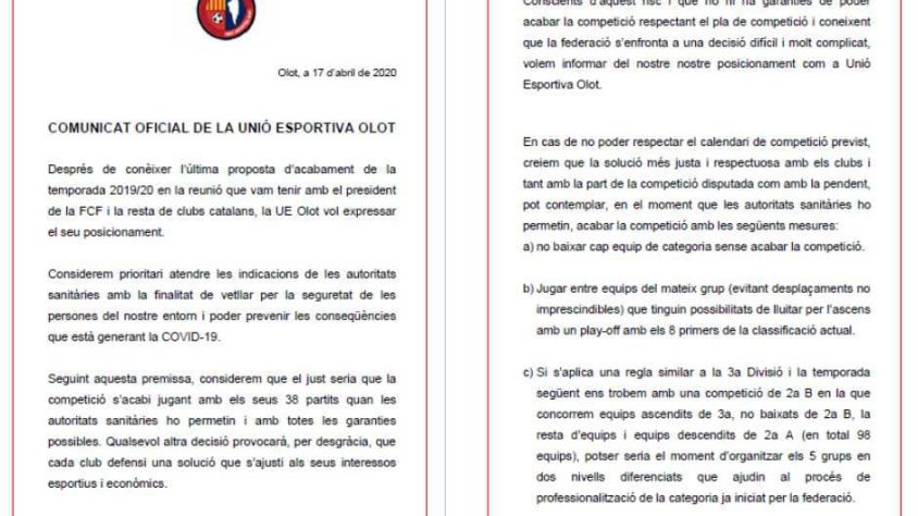 Els clubs de futbol catalans continuen a l'espera d'una decisió definitiva de la Federació Espanyola de Futbol sobre si es donen per acabades les lligues d'aquesta temporada. La Unió Esportiva Olot, que ja va manifestar la seva voluntat d'acabar la competició, ha emès un comunicat aquest dissabte on reitera que això seria el més "just". Tot i així, el club proposa una sèrie de mesures en cas que no es pugui respectar el calendari previst, com ara que cap equip baixi de categoria sense haver jugat tots els partits. També demana de forma oficial, com ja va fer el seu director esportiu Sergi Raset a Olot Televisió, que es jugui un play-off d'ascens entre els 8 primers equips de la classificació amb possibilitats de pujar de categoria. L'Olot també expressa que li agradaria que es fessin cinc grups de 2a B per compensar el gran nombre d'equips que competiria en aquesta categoria la propera temporada si només hi hagués ascensos a 2a B i Tercera Divisió. La plantilla i el cos tècnic donen suport al comunicat pero afirmen que acataran la decisió que es prengui.