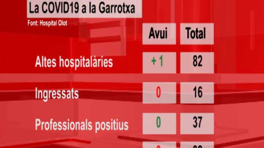 Durant les últimes 24 hores, s'ha donat una nova alta, fent que s'hagin arribat a 82 altes de COVID-19 des de l'inici de la pandèmia a la Garrotxa. Així, actualment hi ha setze ingressats a l'Hospital per la malaltia.