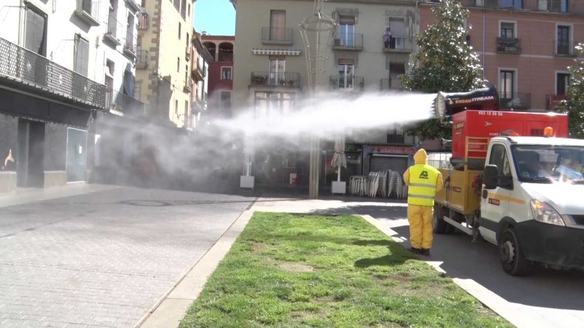 L'Ajuntament d'Olot intensifica les tasques de desinfecció al centre d'Olot amb un sistema de canons nebulitzadors