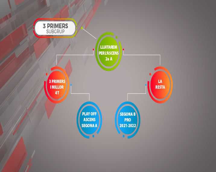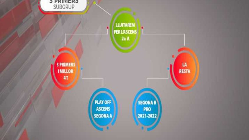 En cas de quedar entre els tres primers passaria a una segona fase per jugar contra els altres millors classificats del subgrup 2 del grup tercer. En cas de quedar, de nou, entre els tres primers i ser millor quart per coeficient accediria a una nova fase: els play-off d’ascens a Segona A, que en cas de no superar-los passarien a jugar la temporada següent a la Segona B pro, la categoria intermèdia entre Segona A i Segona B.
