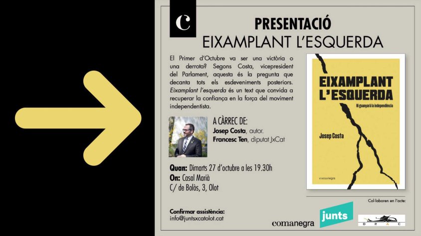 Aquesta tarda, a 2/4 de 8 del vespre, el Casal Marià d’Olot acollirà la presentació del llibre ‘Eixamplant l’esquerda’, de l’editorial Comanegra. A la presentació, hi intervindran el seu autor, el vicepresident del Parlament Josep Costa així com el diputat Francesc Ten. Com que l’aforament és limitat al 33%, l’organització demana inscriure prèviament l’assistència a través d’un correu electrònic a info@juntsxcatolot.cat .