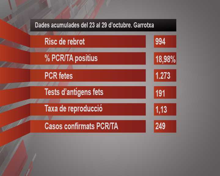 Pel que fa a la taxa de reproducció, segueix sent superior a 1 i en aquests moments és 1,13. La Garrotxa és la segona comarca, per darrera del Pla de l’Estany, amb el % més alt de positius de tot Catalunya.