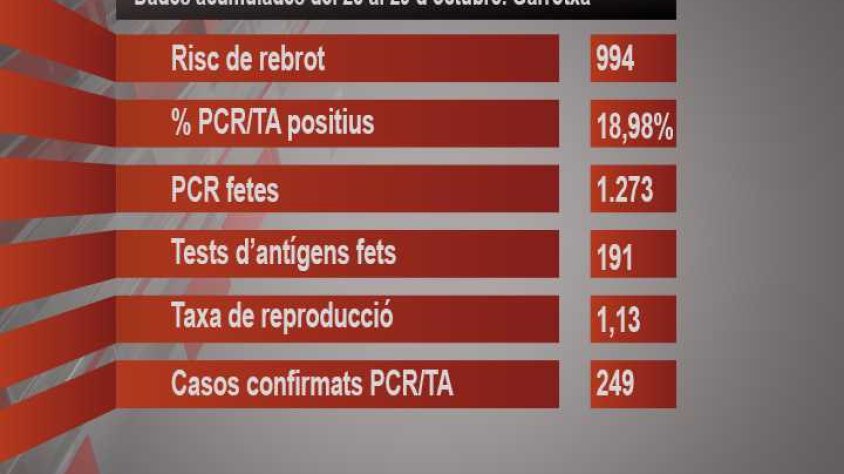 En el període comprés entre el 23 i el 29 d’octubre es van realitzar 1.273 proves PCR i 191 tests d’antígens. D’aquests, prop d’un 19% han resultat positives i s’han confirmat gairebé 250 casos.