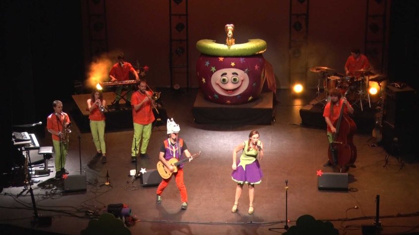 A l'escenari del Teatre Principal, nou músics, que van fer cantar i ballar infants i adults durant una mica més d'una hora. Els mateixos artistes van acceptar que actuar en pandèmia té molts inconvenients, però van explicar que també hi ha coses bones.