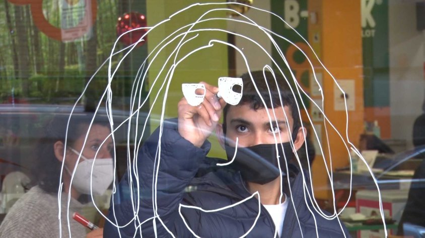 Abel, alumne Escola Joan XXIII: Hem fet els dibuixos a la classe, en paper, i després de seleccionar-los els hem passat a cartró per plasmar-los als vidres del restaurant.