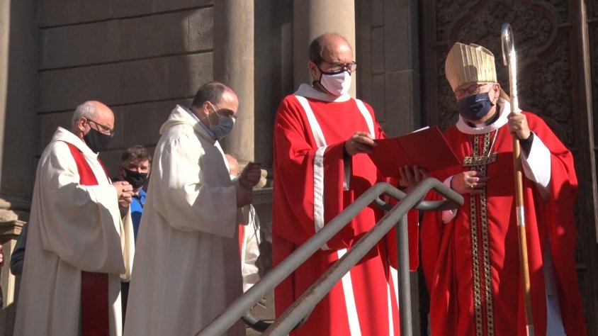Més tard s'ha celebrat la missa solemne a honor de Sant Esteve, presidida pel Bisbe de Girona, Francesc Pardo, i respectant les mesures de seguretat corresponents. En acabat, ha arribat el moment d'inaugurar la restauració de la façana de l'església. El bisbe, que ha beneït l'edifici, també ha presidit l'acte, que ha comptat amb la participació de l'alcalde d'Olot, Pep Berga i l'arquitecta autora del projecte i directora de l'obra, Neus Roca.