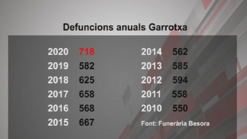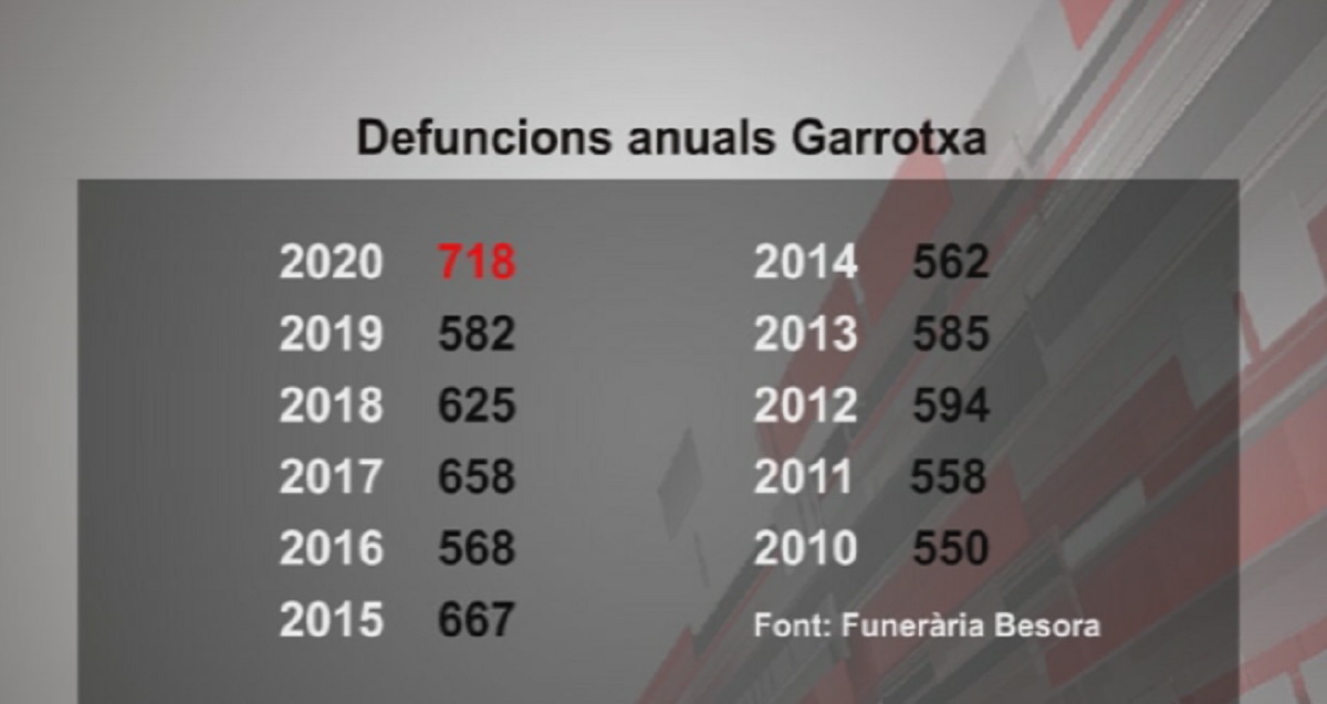 El 2020 va ser l'any amb més defuncions de l'última dècada a la Garrotxa. N'hi va haver 718, un 20% més que la mitjana dels deu anys anteriors.
