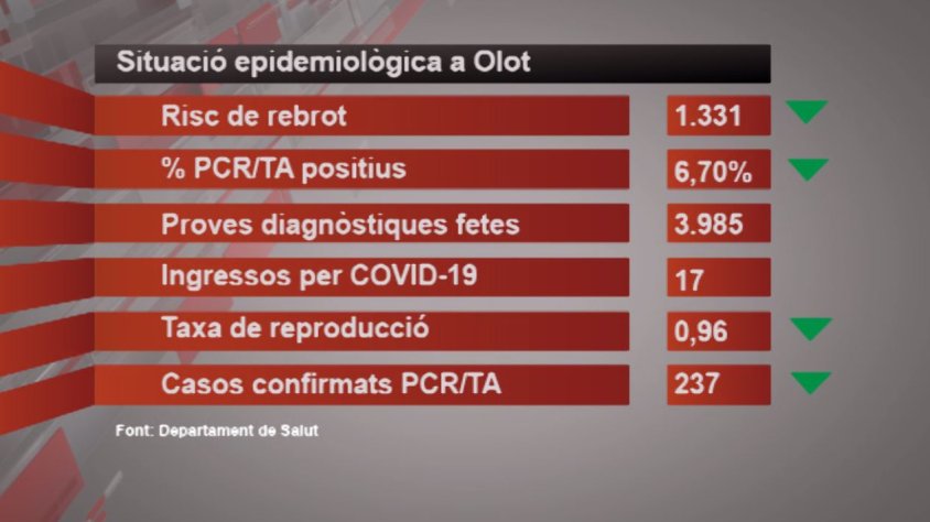 Tot i la millora d’alguns valors, la Garrotxa i la seva capital segueixen sent un dels territoris amb els indicadors de coronavirus més alts de Catalunya. De fet, Olot és el segon municipi amb el risc de rebrot més elevat per darrere de Canet de Mar.
