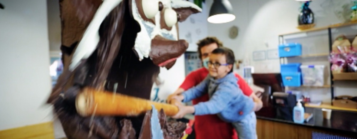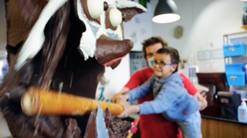 Aquestes imatges que veuen, fa ja dos anys que no es repeteixen, una trencada multitudinària amb centenars de persones a la plaça major d'Olot. El primer any a causa del confinament i el segon, aquest any, per les mesures de seguretat. Malgrat tot, la XIII trencada de mona de la pastisseria Cacau s’ha realitzat d’una manera ben especial. De fet, ha tingut lloc aquest Dilluns de Pasqua a l'obrador de la pastisseria i xocolateria. En l'acte d'esmicolament hi han participat el fill de Lluís Riera, Naüm, i el seu padrí, el cuiner Oriol Sala, del restaurant El Gravat de Vic, com a representant d'un dels col·lectius més perjudicats per la pandèmia.