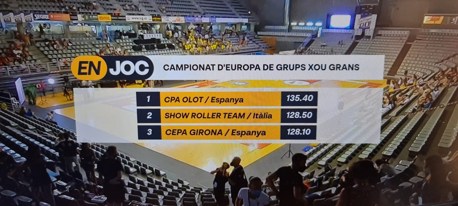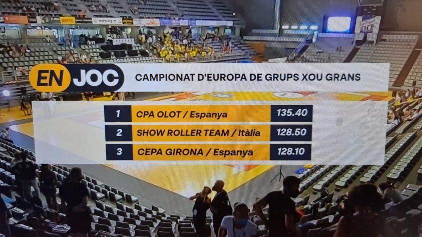 Tret d’alguna petita errada, les olotines van completar una coreografia pràcticament perfecta, amb notes de fins a 9.9 a l’apartat tècnic i de 9.7 a la part artística, que els va donar un total de 135,4, per superar de llarg al segon equip classificat: el Xou Roller Team italià, que va sumar 128,5 , quatre dècimes més que el CPA Girona, que van ser terceres. L’alegria un cop sortides les notes era desbordant per les patinadores olotines.