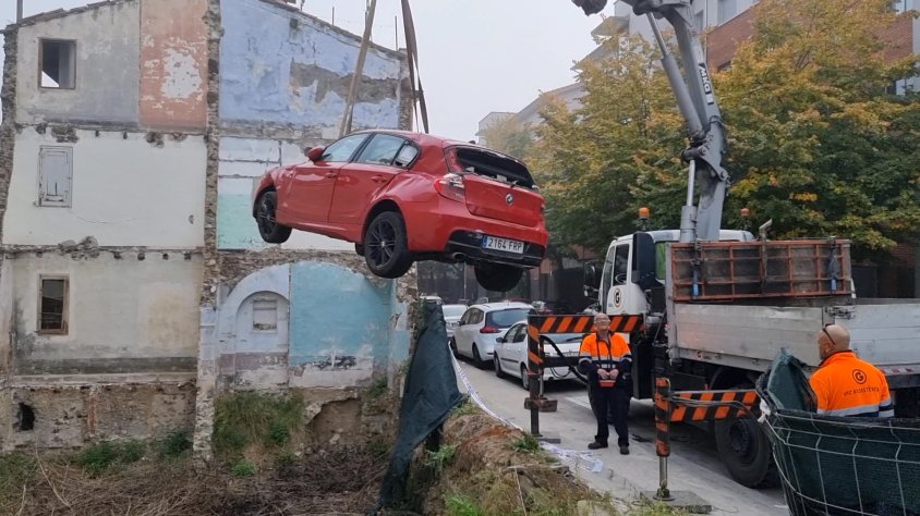 Aquest que veuen a la imatge és el moment que una grua retira aquest vehicle de color vermell de dins d’aquest solar, situat al carrer Closells d’Olot. Es tracta d'un terreny que està en desús després que, ja fa uns mesos, s’enderroqués l’edifici que hi havia. La única protecció que l'envolta és una barana metàl·lica amb una malla.