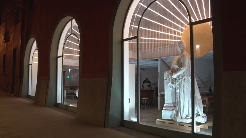 Eduard Callís, Unparelld’arquitectes:“Potenciar aquest actiu per la ciutat que és l’Escola d’Art. S’han destapiat els arcs que hi havia i així es veu el seu interior. A això se suma a aquestes escultures, que ja havien estat a l’escola i estaven ara al magatzem del museu i no estaven visitables al públic. És una espècie de museu descentralitzat, però que també dona aquest pes històric a l’escola, juntament amb l’aula de serigrafia que probament és un dels espais més bonics de l’escola.”
