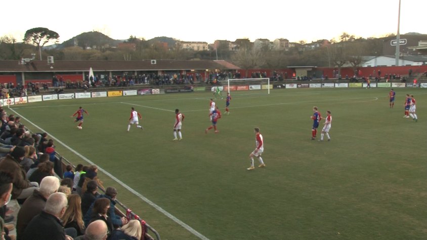 La Unió Esportiva Olot ha sumat un punt aquest diumenge a la tarda davant un rival directe com el Manresa. Més d'un miler d'espectadors han assistit a l'Estadi Municipal per presenciar el partit de la jornada, tot i que els d'Albert Carbó no han pogut aconseguir els tres punts. Salva ha vist la targeta groga quan passaven una mica més de 15 minuts per una dura entrada a Eloi Amagat. Els vermells, vestits també amb la camiseta del centenari, han reclamat l'expulsió. Al minut 24, Xumetra ha posat la bola perfecta perquè Arranz pogués obrir la llauna. Marcava l'Olot i esclatava l'Estadi. 15è gol del davanter aquesta temporada.